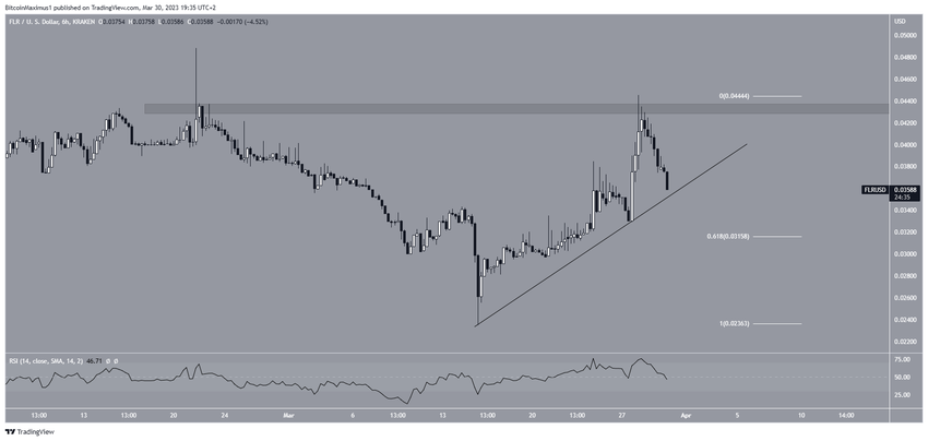 El precio de FLR ha aumentado desde que alcanzó un mínimo de 0.023 dólares el 15 de marzo. El movimiento alcista llevó a un máximo de 0.044 dólares el 28 de marzo. A pesar del aumento considerable, el precio no logró superar el área de resistencia de 0.043 dólares. Actualmente está intentando encontrar soporte por encima de una línea de soporte ascendente.