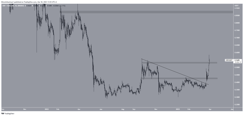 El precio de XRP salió de una línea de resistencia descendente el 21 de marzo y alcanzó un nuevo máximo anual de 0.585 dólares el 29 de marzo. Este fue el precio más alto desde septiembre de 2022. Actualmente, el precio intenta validar el área horizontal de 0.530 dólares como soporte.