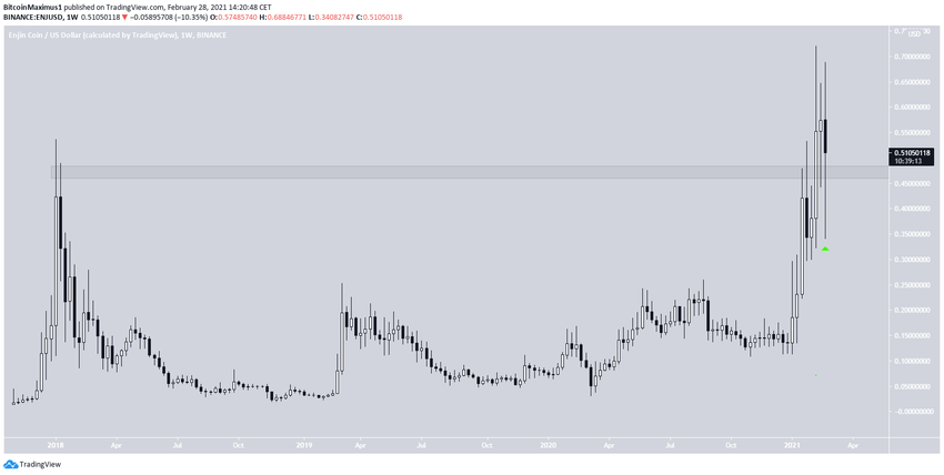 A pesar de la caída en curso, ENJ cotiza por encima del área de resistencia de 0,47 dólares, y ha creado una mecha inferior muy larga debajo de ella lo que se traduce como demanda de compra.