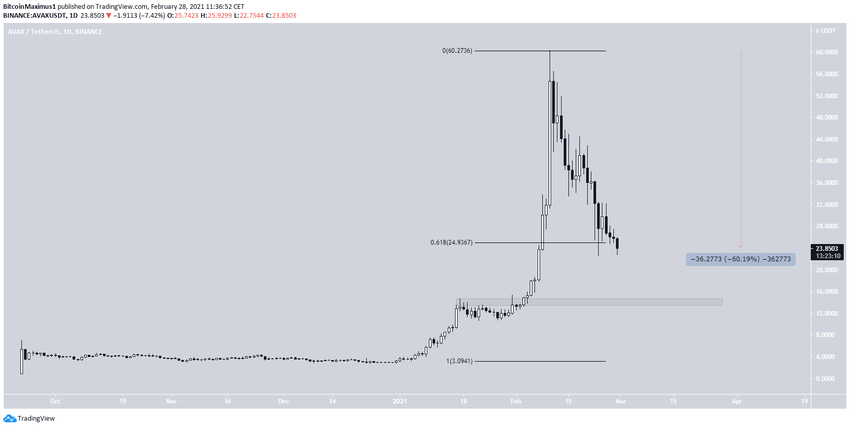 AVAX se cotiza justo en el nivel de retroceso de Fibonacci de 0,618, por lo que, a menos que rebote, podría caer hasta la siguiente área de soporte de 13 dólares.