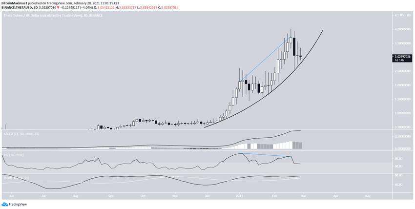El 18 de febrero, THETA alcanzó un nuevo máximo histórico de 4,01 dólares y su línea de soporte parabólica era ascendente, pero desde entonces se ha debilitado y muestra una tendencia bajista en el RSI.