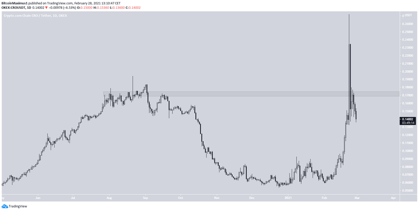 CRO ha caído desde que el 22 de febrero alcanzó un máximo de 0,27 dólares. Se cotiza a 0,14 dólares, por debajo del área de resistencia principal de 0,17 dólares.