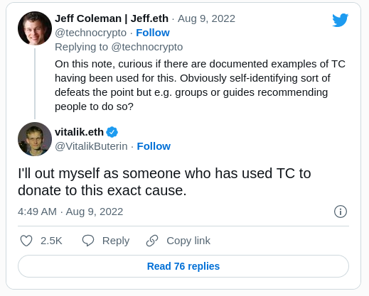 “Querer donar a Ucrania es un gran ejemplo de una necesidad válida de privacidad financiera […] En esta nota, es curioso si hay ejemplos documentados de TC que se hayan utilizado para esto”, compartió Jeff Coleman, cofundador de Counterfactual, en su Twitter.