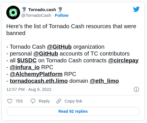 El cofundador de Tornado Cash, Roman Semenov, compartió que su cuenta de GitHub fue suspendida, junto con una serie de otros recursos de TC, incluida la organización Tornado Cash GitHub, direcciones de contratos inteligentes vinculadas a Tornado Cash on Circle, RPC de Infura y otros.