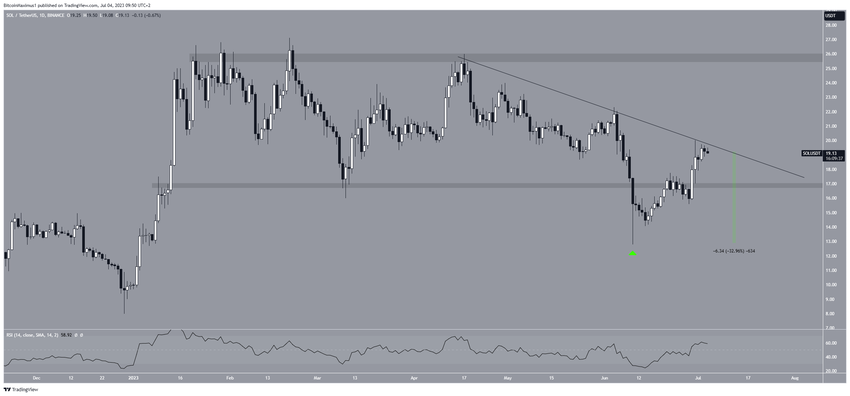 A pesar de esta predicción alcista del precio SOL, caer nuevamente entre el área de soporte de 17 dólares significará que la tendencia sigue siendo bajista.