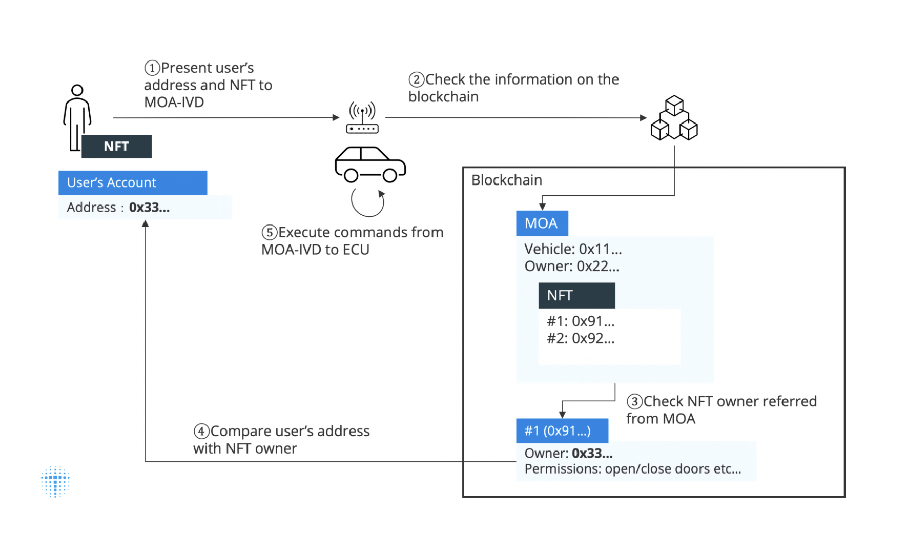 “Para representar digitalmente la movilidad, es importante gestionar digitalmente operaciones básicas como desbloquear la llave y arrancar el motor. Para las operaciones de hardware, MOA-IVD se refiere al estado de MOA en la cadena de bloques, que luego envía señales al automóvil”, explicó Toyota.