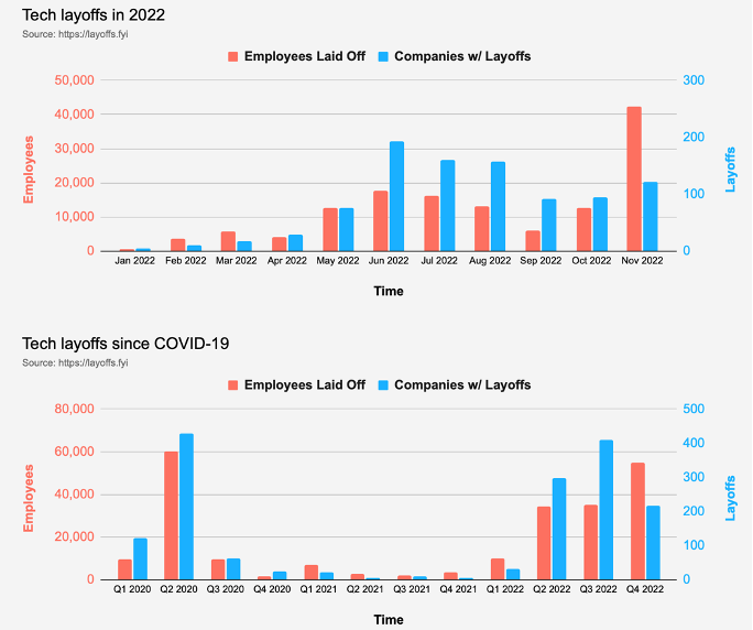 136,989 empleados fueron despedidos por 849 empresas tecnológicas de todo el mundo solo en 2022 según los conjuntos de datos de layoffs.fyi, una base de datos de colaboración colectiva de despidos tecnológicos.