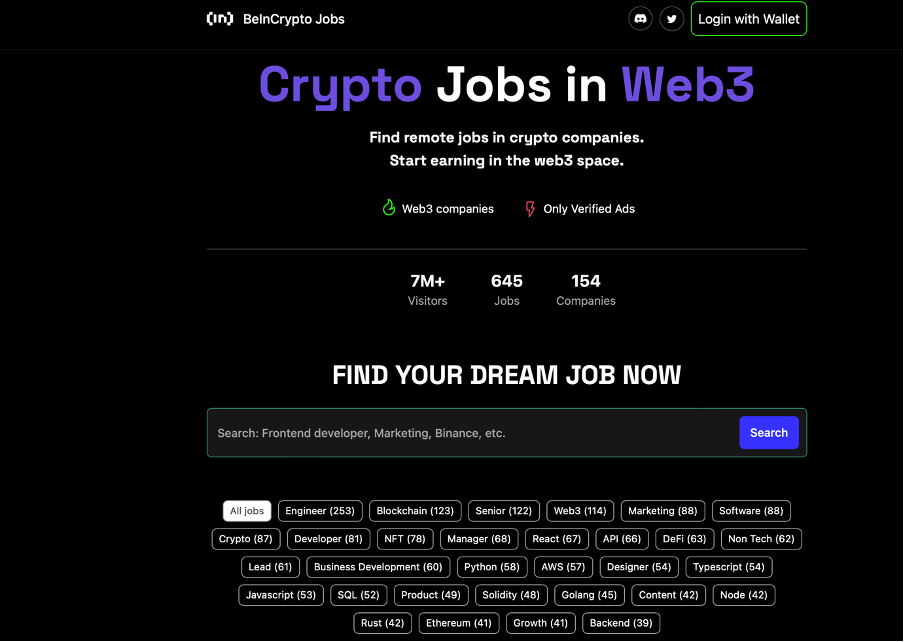 BeInCrypto Jobs actualmente enumera 645 puestos vacantes de 154 empresas dentro de diferentes nichos que van desde marketing hasta desarrollo de software e investigación de contenido.