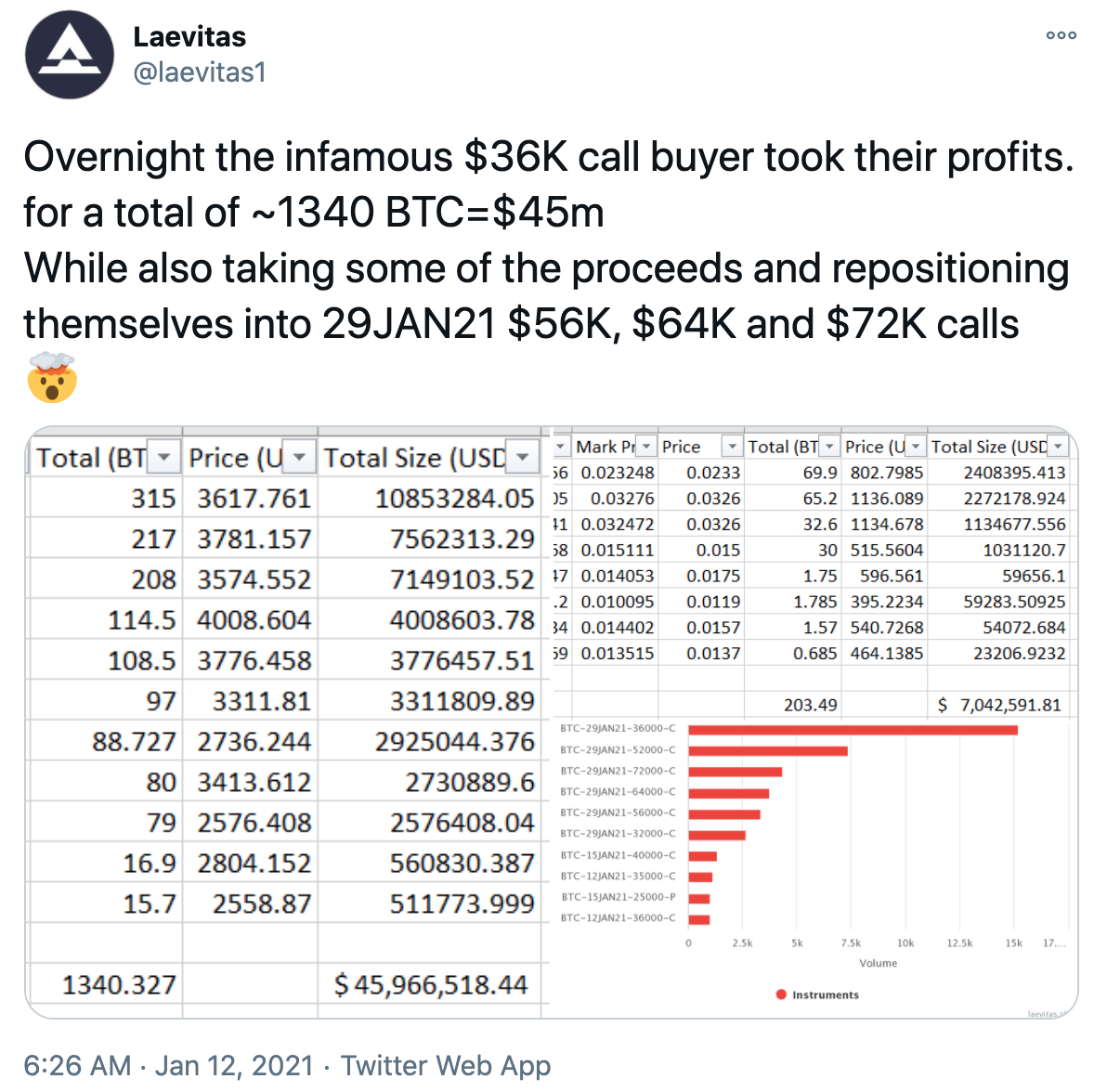 El trader anónimo llamó la atención de la comunidad al apostar tan fuertemente por la valoración de Bitcoin cuando el precio todavía estaba en 22.000 dólares en diciembre. En ese momento, compró contratos que le daban el derecho de comprar Bitcoin por 22.000 dólares si la criptomoneda llegaba a 36.000 dólares en una fecha determinada.