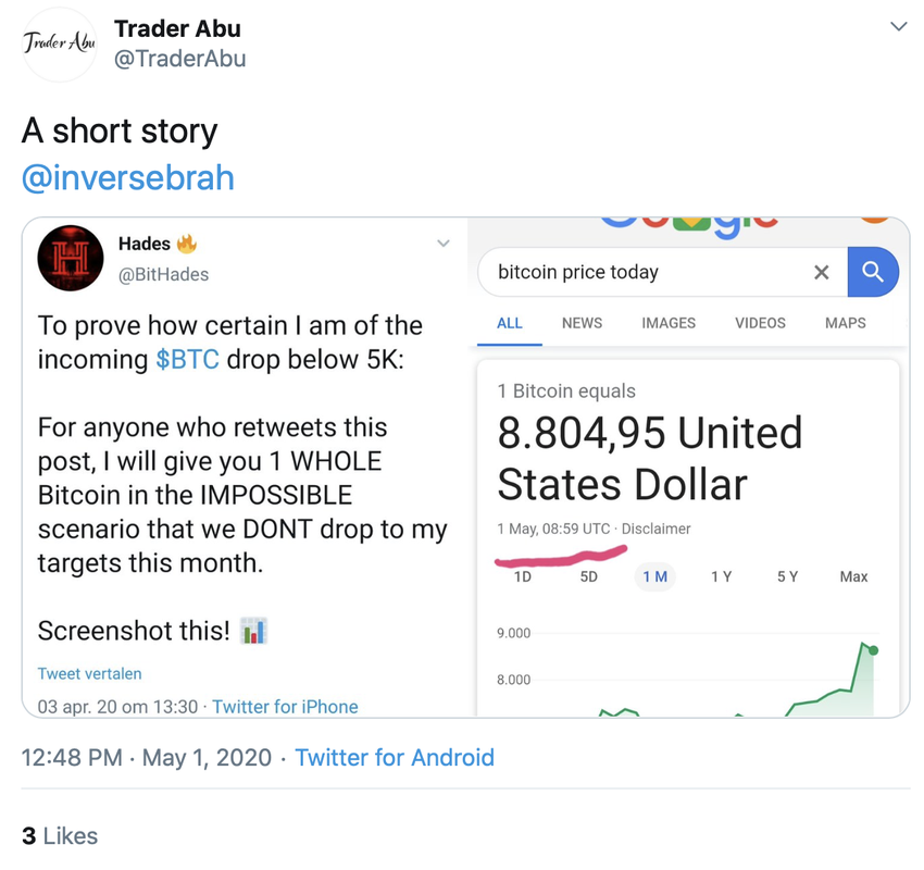 Pillado con capturas de pantalla por Trader Abu (@TraderAbu), Hades prometió dar a cada persona que volviera a retwittear su predicción un BTC a cada uno si se cumplía. Su predicción fue que el BTC caería por debajo de los $5.000 en abril. Eso no terminó sucediendo — y ahora Hades no se encuentra en ninguna parte.