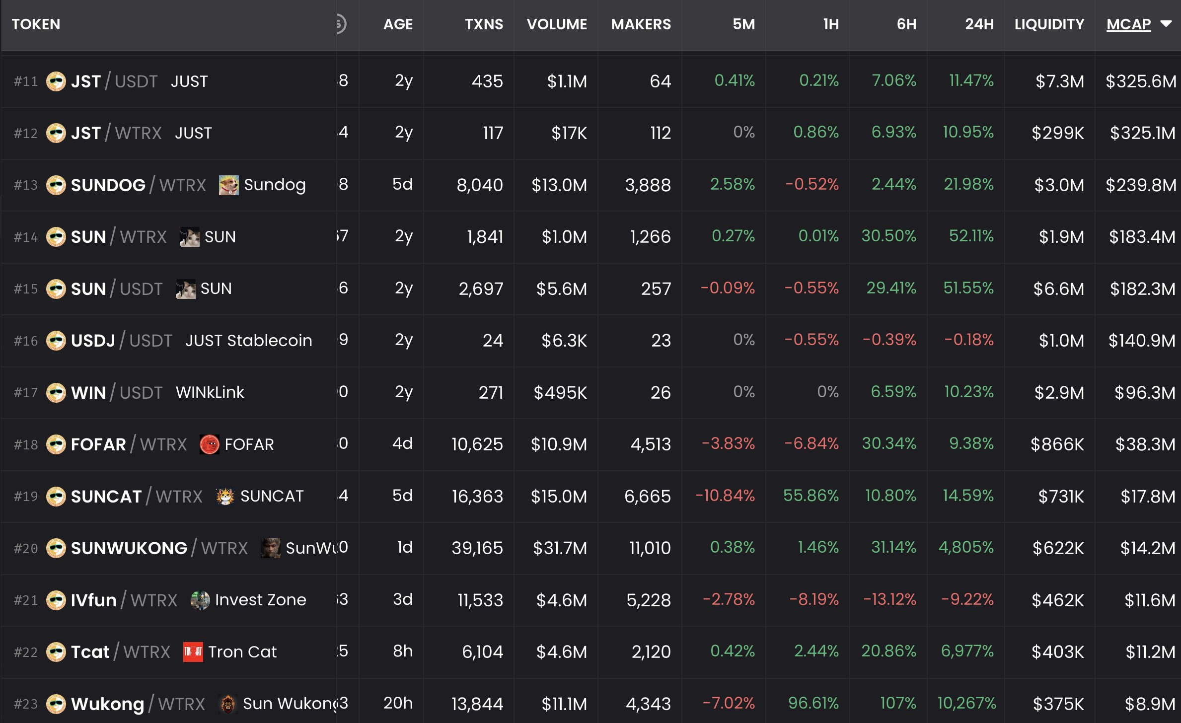 SUNDOG no es la única memecoin basada en TRON que ha registrado ganancias importantes. Las criptomonedas meme JUST (JST), SUN y SUNCAT también han aumentado considerablemente.