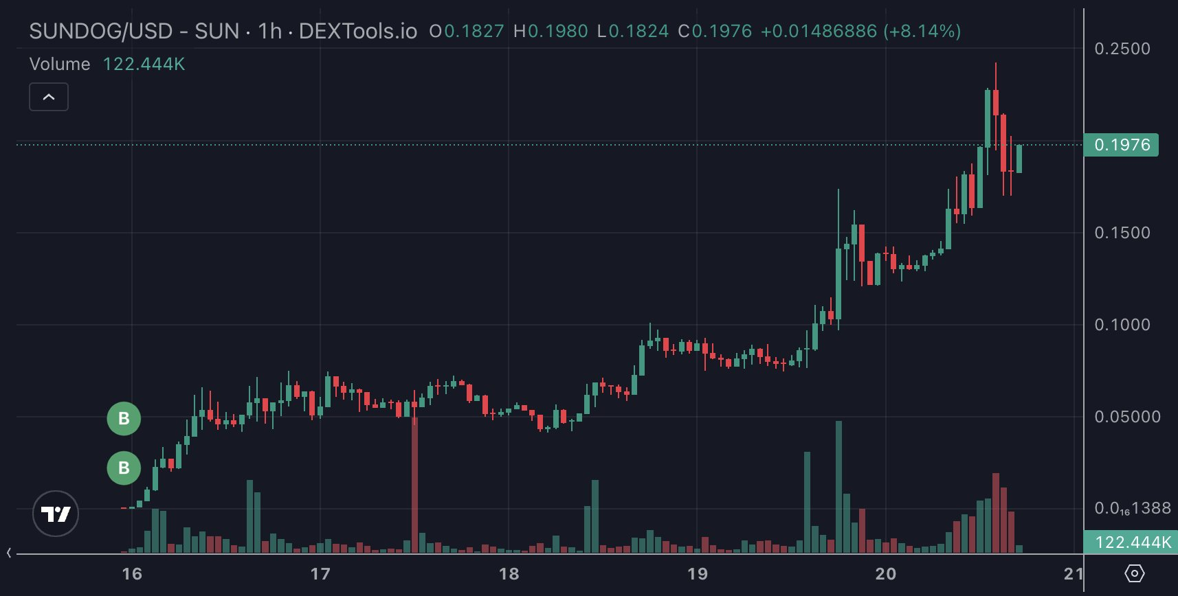 Previamente, BeInCrypto informó que el precio de SUNDOG se había disparado aproximadamente 100x en pocos días, pasando de 0.002 dólares a 0.20 dólares.