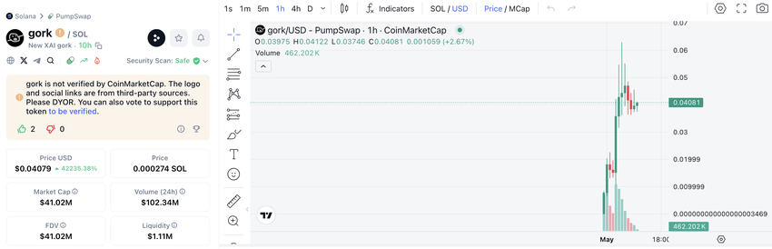GORK es una nueva memecoin lanzada en el launchpad Pump.fun de la red Solana (SOL) hace menos de un día. En las primeras 24 horas, su precio ha aumentado más del 42.000%: al momento de escribir este artículo, el token se cotiza a 0.04095 dólares.