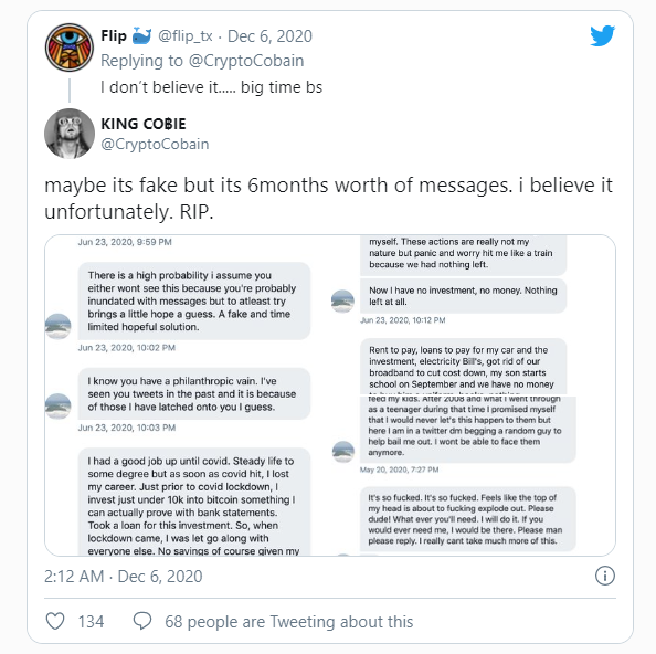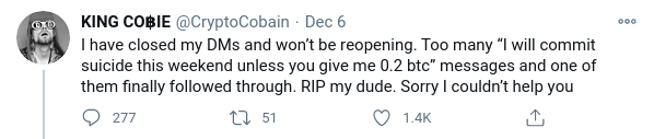 El 6 de diciembre de 2020, Jordan Fish, conocido por su pseudónimo cripto KING CO฿IE o @CryptoCobain, cerró el acceso a mensaje directos de Twitter. Lo hizo después de que un trader que le rogaba ayuda financiera supuestamente se quitara la vida.