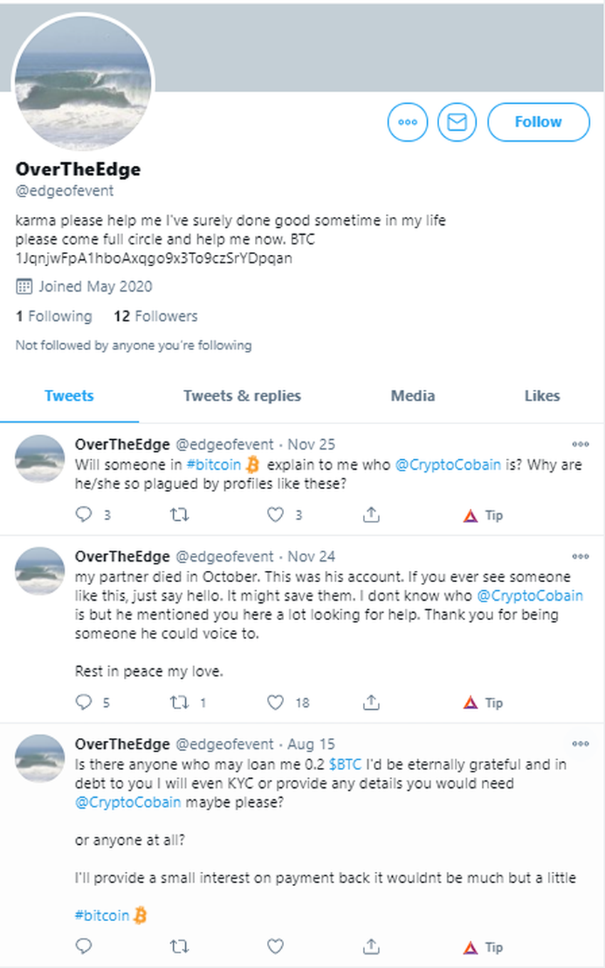 Un usuario de Twitter, Business Cat (@buznizkat) afirma haber identificado el apodo del fallecido como OverTheEdge (@edgeoverevent). Las publicaciones de OverTheEdge en Twitter se remontan a meses atrás, quejándose de las crecientes dificultades tanto financieras como de la vida en general, y hablando sobre su intento frustrado de toma de contacto con cripto Twitterati como @stoolpresidente y @CryptoCobain para conseguir ayuda y consejo.