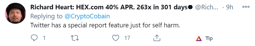 Incluso Richard Heart, que tiene un pasado algo escabroso, mencionó que Twitter tiene una función para informar de intenciones de suicidio o autolesiones.