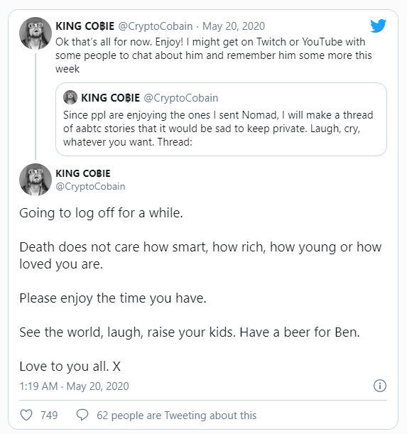 Curiosamente, esta no es la primera vez que Cobain comenta públicamente sobre una muerte. En mayo de 2020, un joven llamado Ben, bajo el nombre de usuario @ACTUALADVICEBTC en Twitter, murió repentinamente en Tailandia. Ben era una figura de culto y era popular en varias redes sociales, incluido Steemit.