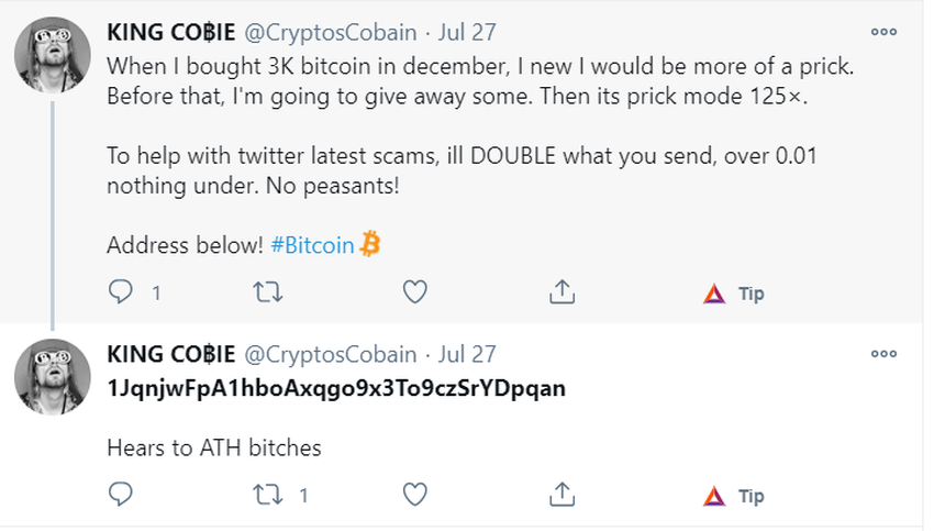 Pero eso no es todo. La cuenta también incluye una dirección de Bitcoin. Lo que es más interesante, esta dirección fue utilizada por una cuenta de suplantación de identidad llamada @CryptosCobain. En un tweet de esta cuenta del 27 de julio de 2020, el farsante se hace pasar por @CryptoCobain y ofrece duplicar el BTC enviado a su dirección (una estafa). Esta es la misma dirección que aparece en la cuenta de OverTheEdge.