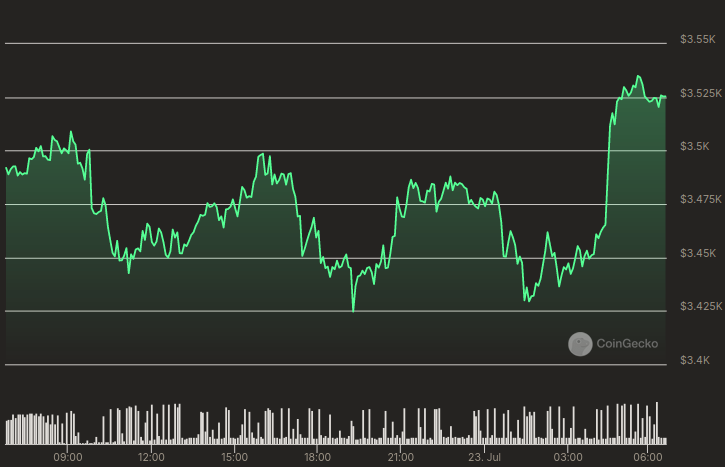 Según CoinGecko , en el momento de escribir este artículo, ETH se cotiza a 3,524 dólares. En las últimas 24 horas, el precio del activo ha aumentado un 1.4% y durante la semana pasada, un 4.4%.