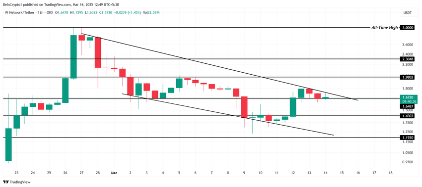 El precio de Pi Network se mantiene actualmente en 1.67 dólares, justo por encima del nivel de soporte de 1.64 dólares. Si bien intenta romper el canal descendente, las condiciones actuales del mercado sugieren que dicha ruptura podría ser difícil.