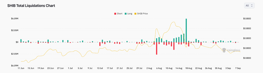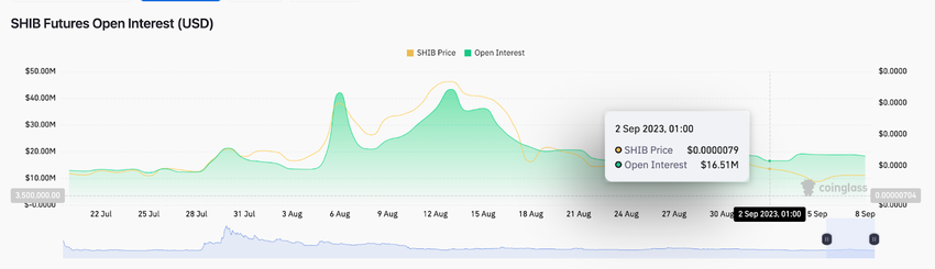 Entre el 2 y el 8 de septiembre, el interés abierto de SHIB aumentó en 1,8 millones de dólares. Mientras tanto, el siguiente gráfico muestra que el precio de SHIB ha disminuido otro 4% durante ese período.