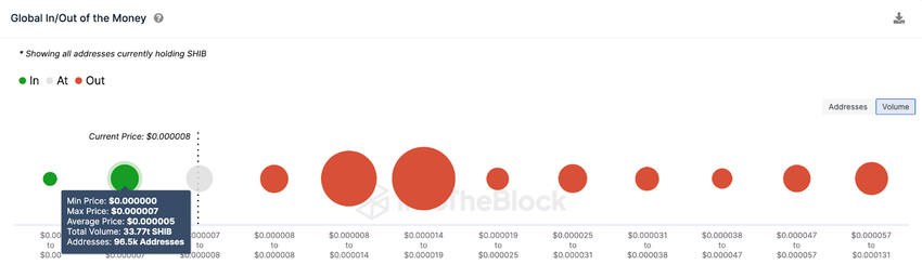 La dinámica actual en los mercados de derivados sugiere que los operadores inversos de SHIB podrían empujar el precio por debajo de 0.000007 dólares. Los datos de Global In/Out of the Money (GIOM) representan la distribución del precio de entrada de los holders actuales de SHIB.