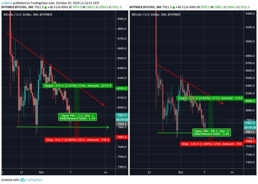 Si bien puede parecer contrario a la intuición abrir una posición larga dentro de un patrón bajista, vale la pena señalar que el precio está en la línea de soporte del triángulo.