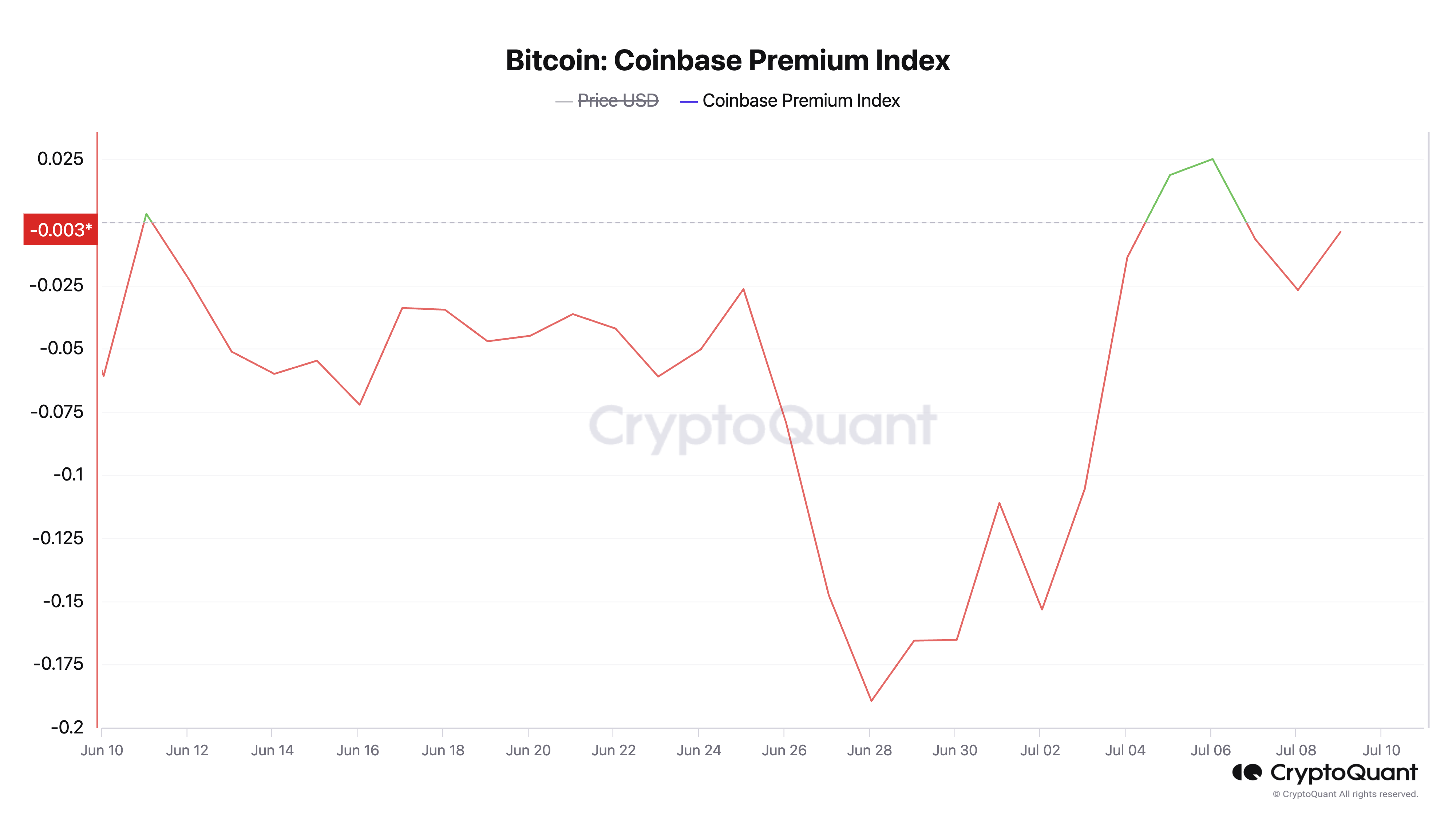 Los datos on-chain muestran que el Coinbase Premium Index de Bitcoin es de -0.003 en este momento. Esta métrica mide la diferencia entre los precios de BTC en Coinbase y Binance.