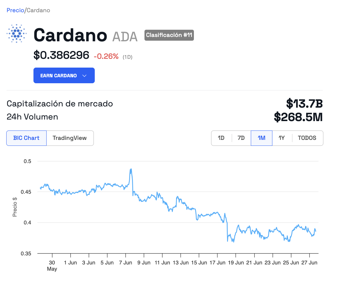 SponsoredEl aumento en el volumen de trading se vio reflejado en el precio de ADA, el cual pasó de 0,37 dólares a 0,39 dólares. En tanto, el volumen de trading de la criptomoneda se incrementó 7,22% en las últimas 24 horas, hasta situarse en 261,7 millones de dólares.