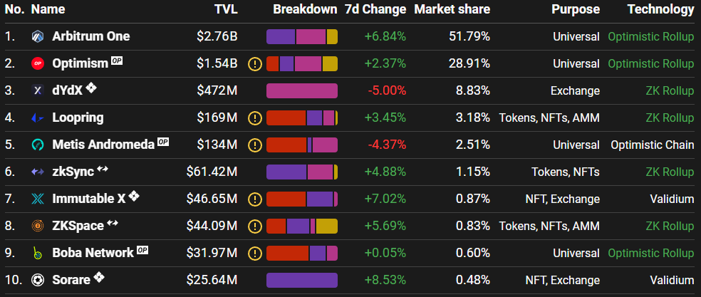 Otro dato destacable es que Arbitrum se ha convertido en la L2 de Ethereum con mayor Total Value Locked (TVL). De acuerdo a L2BEAT, la red posee 2.76 mil millones de dólares bloqueados, superando por mucho a Optimism, su competencia más cercana.