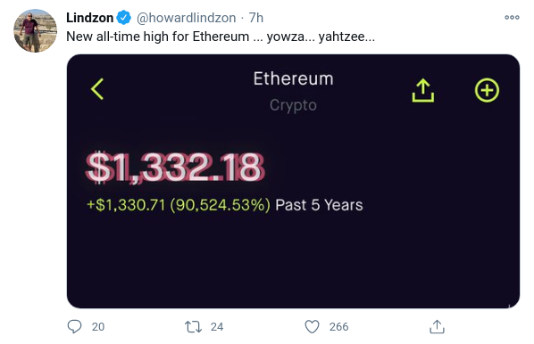 Los precios de Ethereum se han disparado en las últimas 24 horas, añadiendo un 7,5% desde la misma hora ayer. Según TradingView, ETH estaba vendiéndose por 1.338 dólares cuando se redactó este artículo, solo un 8% más o menos de su máximo histórico.