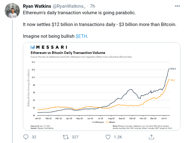 Según los últimos datos de Messari, las transacciones de Ethereum se han disparado en enero a un récord de 12 mil millones de dólares. Esta cifra es un promedio móvil de 30 días que despegó alrededor del día de año nuevo.