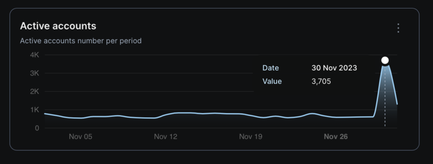 El número de usuarios activos de blockchain también sigue creciendo. Desde principios de noviembre, ha aumentado de 785 a 3,705 direcciones.