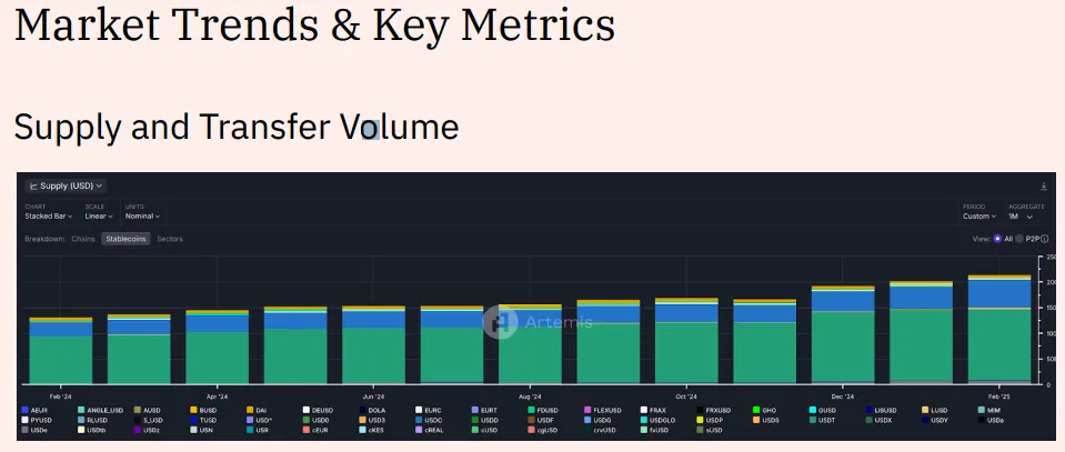 Artemis y Dune Analytics realizaron un informe sobre el Estado de las Stablecoins en 2025, explorando el suministro, la adopción y las tendencias del mercado. Según los hallazgos, el suministro total de stablecoins ha alcanzado los 214 mil millones de dólares, con hasta 35 billones de dólares en transferencias durante el último año.