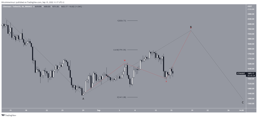 Desde el máximo del 15 de agosto, parece que ETH ha estado cayendo dentro de una estructura correctiva A-B-C (negro). Para que se produzca el movimiento ascendente hacia 1,800 dólares, ETH tendría que estar todavía en la onda B.