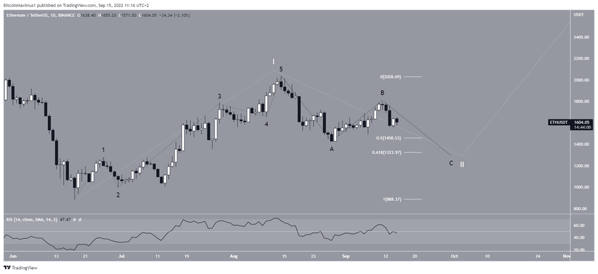 Si la onda B está completa, entonces ETH estaría en la onda C, que se espera que termine cerca del nivel de soporte de retroceso de Fibonacci de 0.618 (blanco) en 1,325 dólares.
