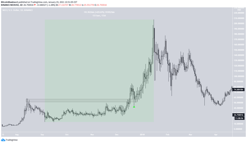 NEO logró salir por encima de la zona de alta resistencia de todos los tiempos después de 126 días. Posteriormente, lo validó como soporte el 24 de diciembre (mostrado con la flecha verde en la imagen de abajo) y aumentó rápidamente para alcanzar el actual máximo histórico.