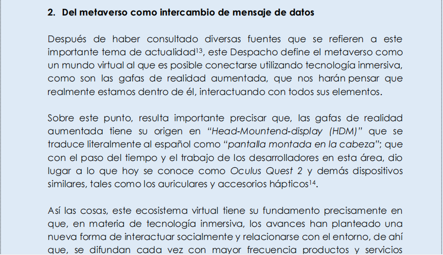 “Este despacho define el metaverso como un mundo virtual al que es posible conectarse utilizando tecnología inmersiva, como son las gafas de realidad aumentada, que nos harán pensar que realmente estamos dentro de él, interactuando con todos sus elementos.”