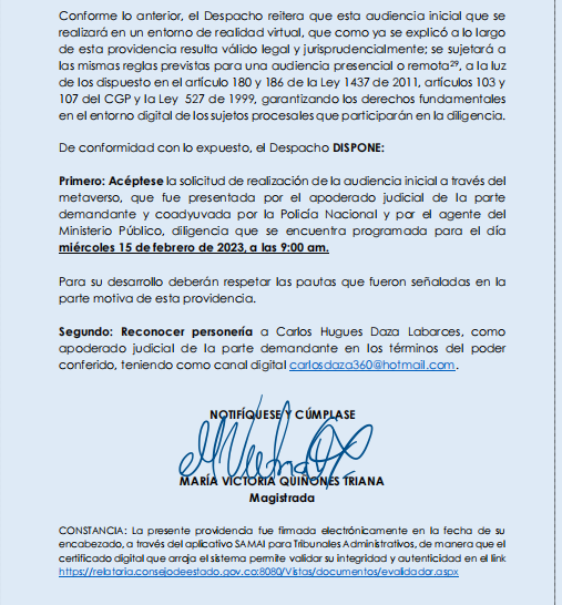 “El apoderado judicial de la parte demandante, solicitó que la audiencia inicial programada en el asunto de la referencia se llevara a cabo en el metaverso, y en cumplimiento a lo dispuesto en el numeral 14 del artículo 78 del Código General del Proceso e inciso 2º del artículo 186 de la Ley 1437 de 2011, envió por correo electrónico a las demás partes del proceso, copia de la solicitud presentada que hoy es objeto de análisis. Al respecto, el apoderado judicial de la Policía Nacional manifestó su aceptación y participación de la audiencia inicial programada para el día miércoles 15 de febrero del presente año, de la forma propuesta por la parte demandante, con el fin además de apoyar el desarrollo e innovación de la utilización de medios tecnológicos.”
