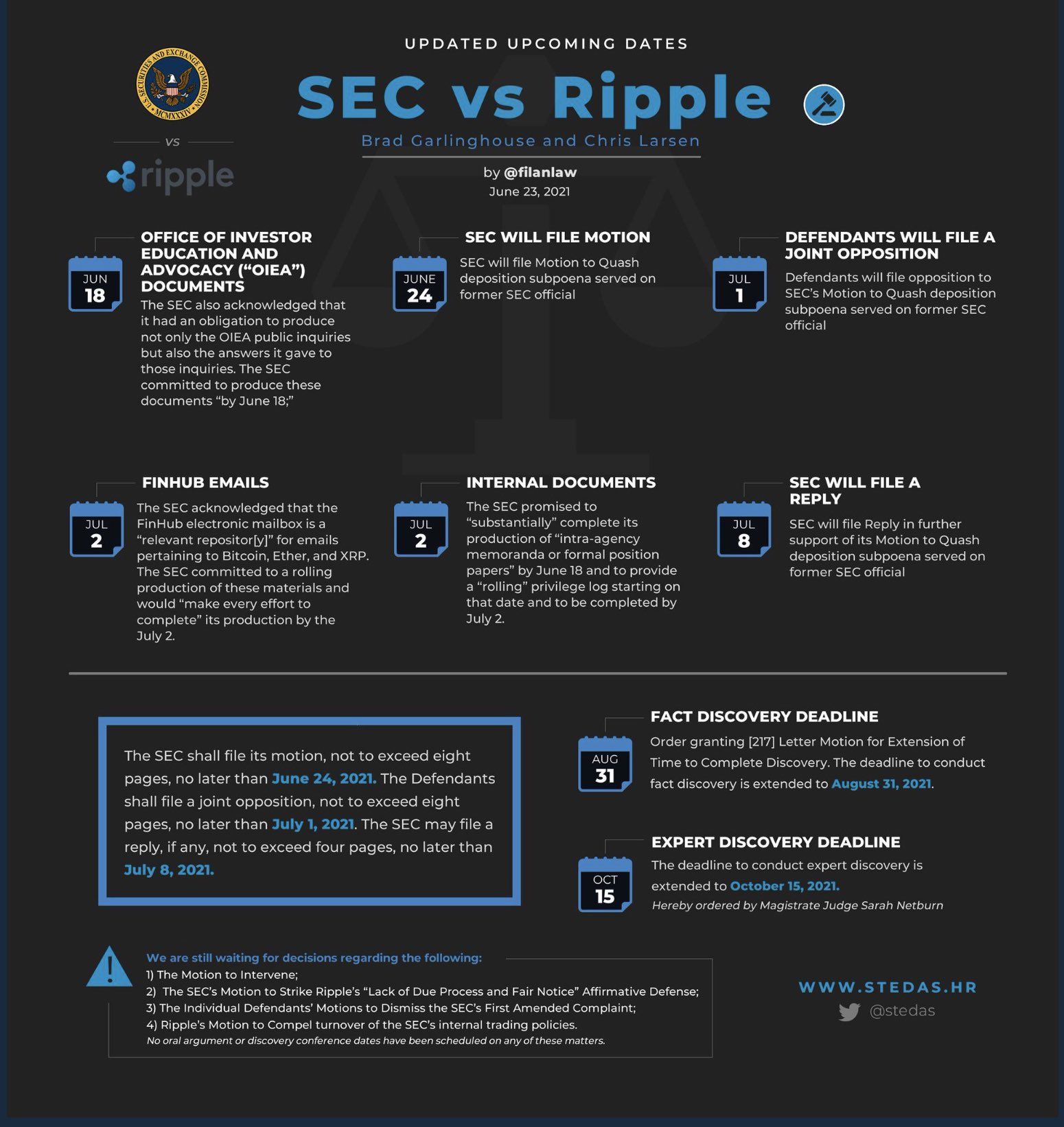Posteriormente, el abogado de Ripple compartió una imagen cortesía de @stedas referente a las próximas fechas clave en el caso Ripple-SEC: