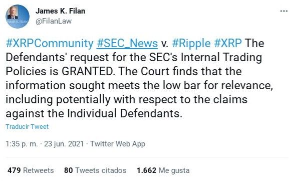 La información fue dada a conocer por el abogado defensor de Ripple, James K. Filan, quien tuiteó al respecto: