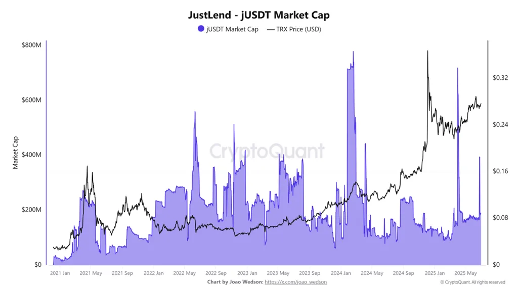 Mientras tanto, los últimos datos de JustLend muestran picos impresionantes en el volumen de transferencia y capitalización de mercado de jUSDT, señalando un renovado interés de los inversores en la actividad de préstamos en Tron. Al 30 de junio de 2025, la capitalización de mercado de jUSDT alcanzó los 186,58 millones de dólares.