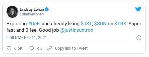 Lohan no solo dijo que era fanática de TRX, sino también de JUST (JST) y SUN (SUN), dos criptomonedas oscuras disponibles en la plataforma. Ella comentó sobre ellas “muy rápidamente” antes de etiquetar y felicitar a Justin Sun, el creador de la plataforma.