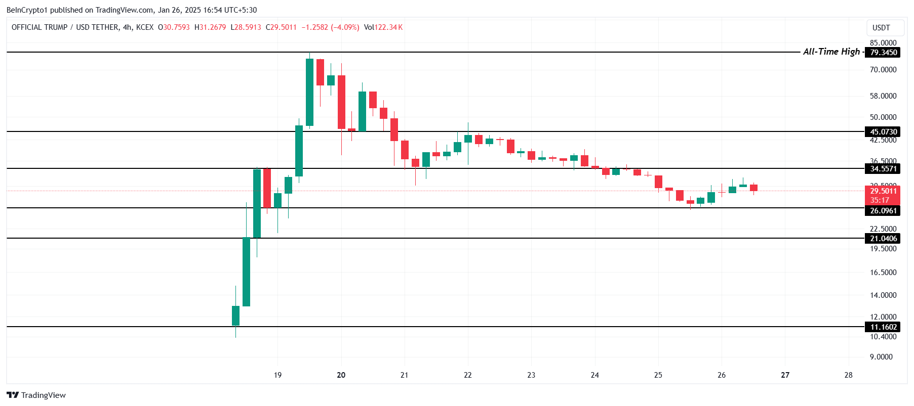El token TRUMP, que recientemente alcanzó un máximo histórico (ATH) de 79 dólares, ahora está luchando contra una fuerte tendencia bajista. Actualmente negociado a 29 dólares, la memecoin ha tenido dificultades para mantener su impulso, con su valor erosionándose en los días posteriores a su pico.