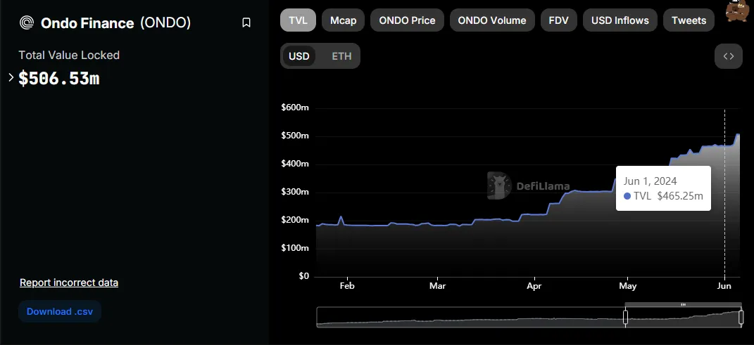 El valor total bloqueado (TVL) de Ondo Finance se ha disparado 43% desde mayo. Pasó de 352,67 millones de dólares el 1 de mayo a 506 millones de dólares el 6 de junio. TVL es una métrica importante que se utiliza para medir la adopción y el éxito de las plataformas financieras descentralizadas.
