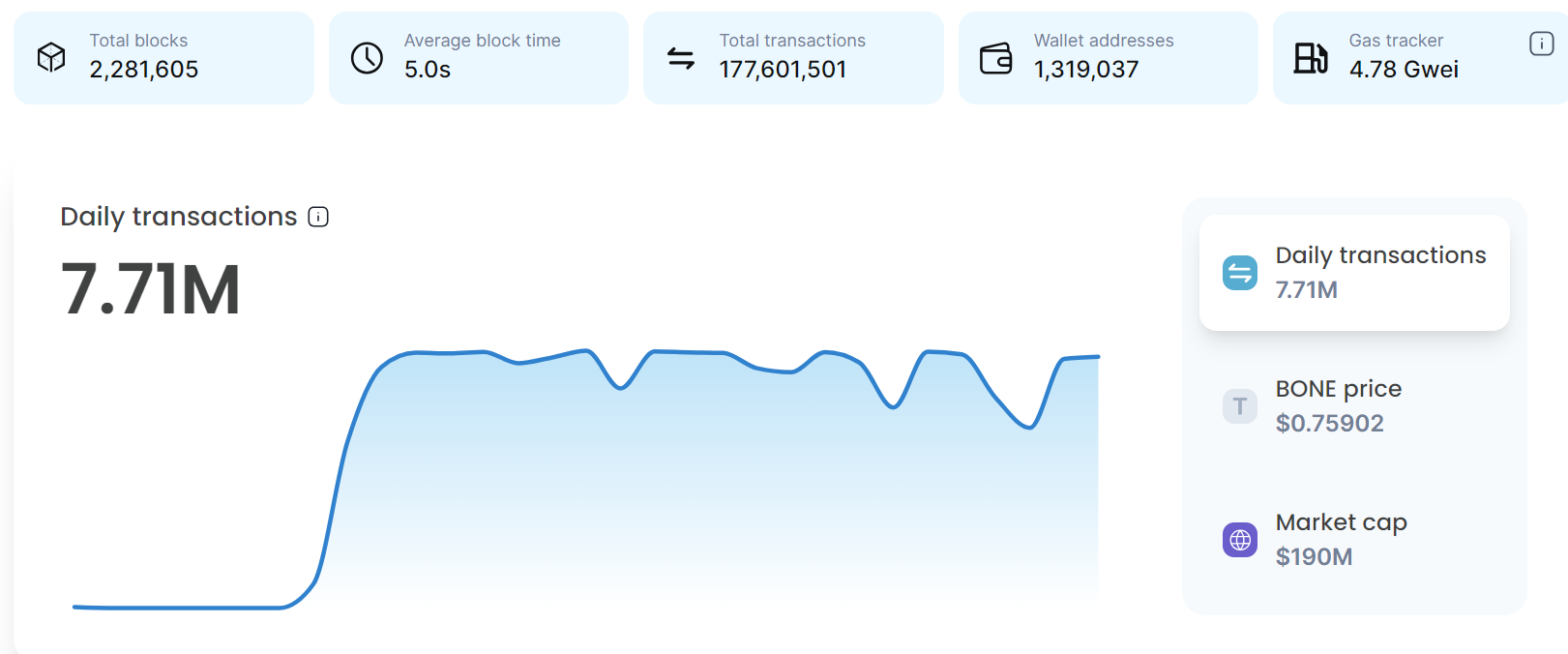Además, la blockchain L2 ha experimentado un pico de transacciones a lo largo de diciembre. La red ha promediado alrededor de 7 millones de transacciones diarias, elevando su total a 177 millones desde los 2,2 millones de bloques.