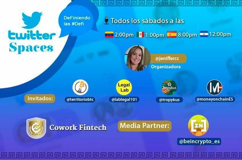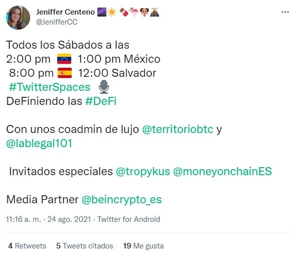 El pasado sábado 28 de agosto del 2021 se realizó un Twitter Space que tuvo por nombre “DeFiniendo las DeFi”, en donde BeInCrypto fue media partner. El evento fue moderado por Jeniffer Centeno, con la participación de Territorio Bitcoin, Manu Ferrari, Diego Mazo y Legal Lab.