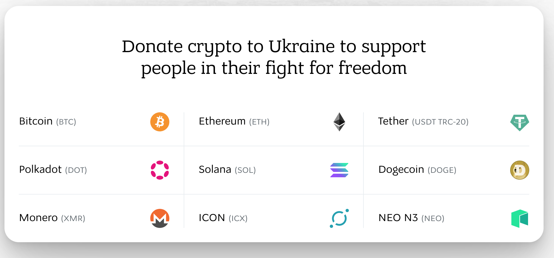 Como informó BeInCrypto, el gobierno ucraniano ya ha conseguido recaudar más de 50 millones de dólares mediante la donación de criptomonedas por individuos por todo el globo. Ayer mismo estrenó su página web oficial para formalizar el mecanismo para recibir capital directamente tanto con criptomonedas como también en dinero fiat en varias divisas (USD, EUR, GBP, AUD, CAD), una variedad de bancos ha participado (JP Morgan Chase Bank, Deutsche Bundesbank, Reserve Bank of Australia, Bank of Montreal).