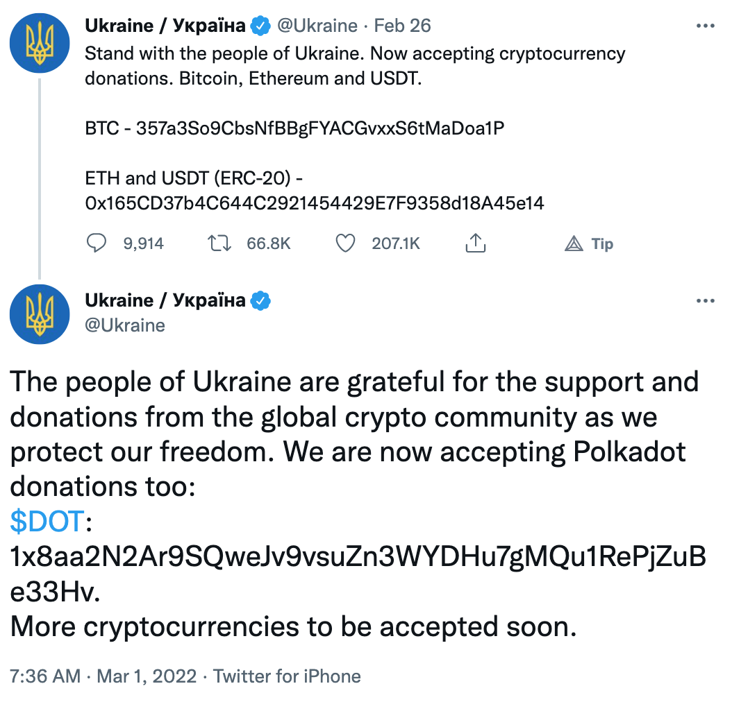 Después del éxito cosechado, Polkadot (DOT) fue añadido y tras su inclusión obtuvo una donación cuantiosa en DOT por el valor de 5 millones de dólares por parte de su CEO, Gavin Wood. Poco después, Solana (SOL) y Dogecoin (DOGE) fueron incluidos en la lista, cumpliendo así la declaración del gobierno ucraniano que confirmó que mas criptomonedas serían añadidas. Ayer mismo, la colaboración entre el Ministerio de Transformación Digital de Ucrania, el exchange FTX y la empresa ucraniana de staking Everstake cumplió su promesa añadiendo tres vías más:
