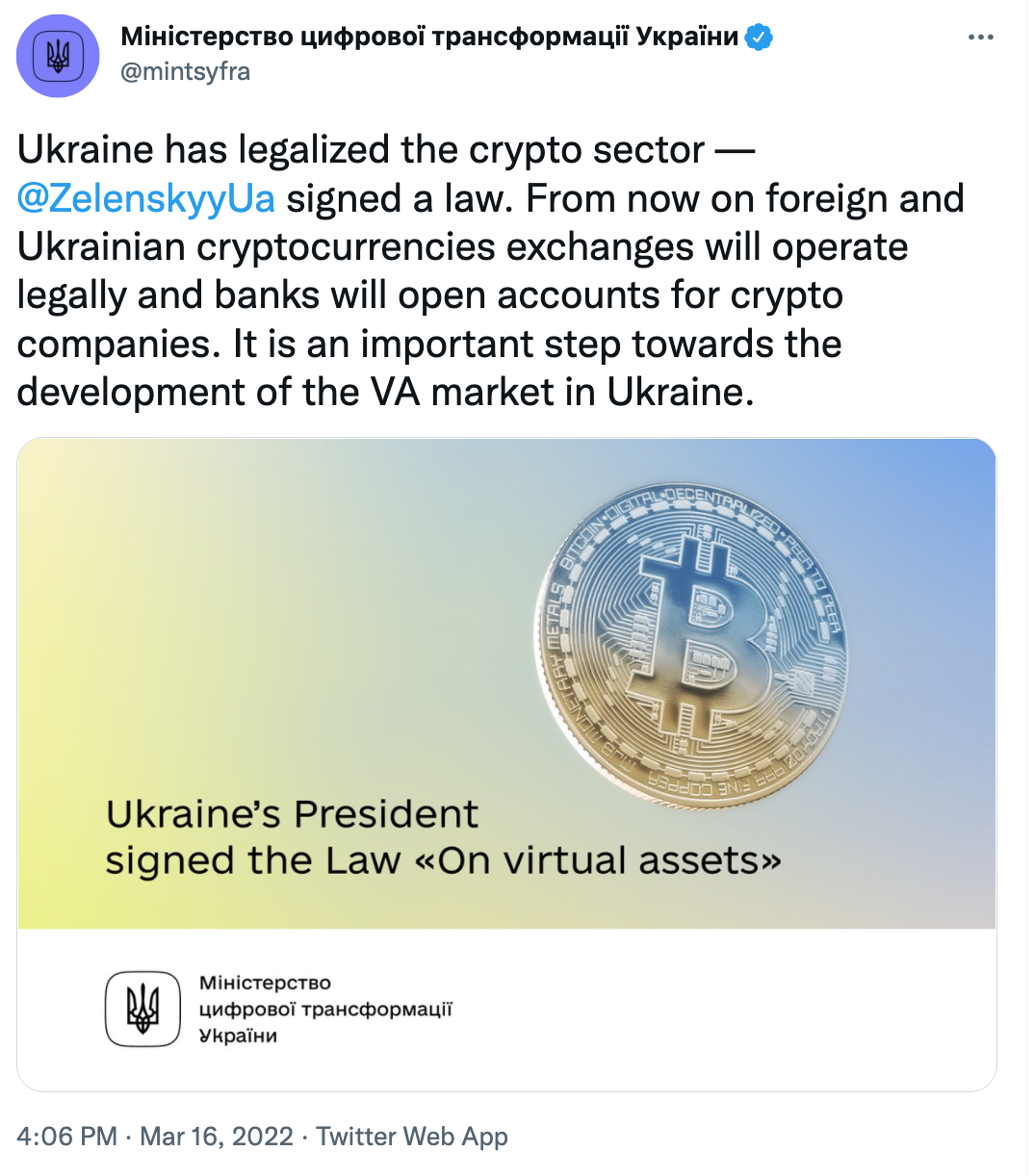 Hoy, 16 de marzo, el Ministerio de Transformación Digital de Ucrania confirmaba mediante un tuit desde su cuenta oficial que Ucrania ha legalizado el sector cripto en su territorio.